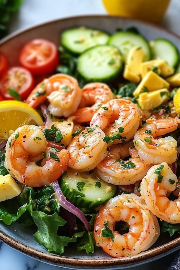 سلطة خفيفة ومنعشة تجمع بين البروتين من الجمبري والخضروات الطازجة مع توابل بسيطة تعزز النكهة، مثالية كوجبة صحية غنية بالفيتامينات وقليلة السعرات