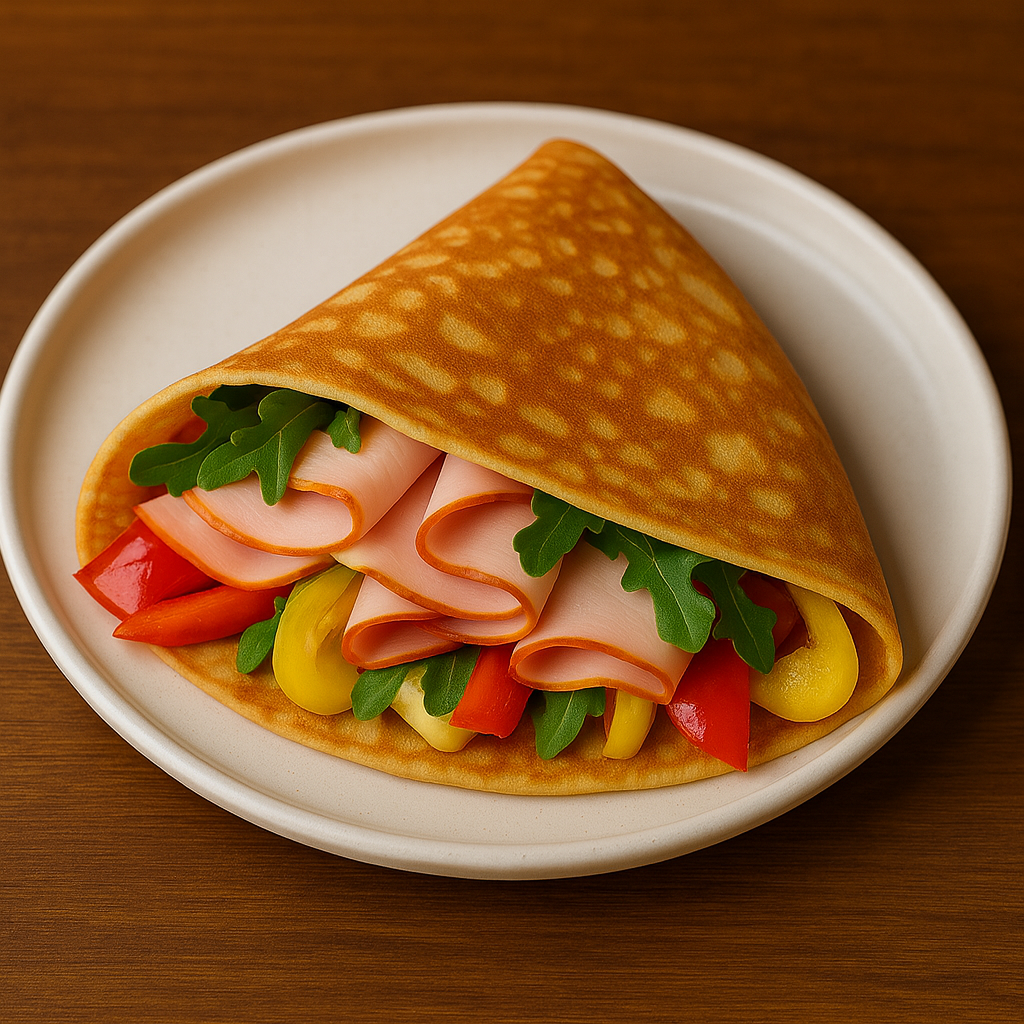 كريب خفيف ولذيذ يحتوي على شرائح تركي مدخن، جبنة شيدر، وخضروات طازجة، مثالي لوجبة مشبعة وسريعة